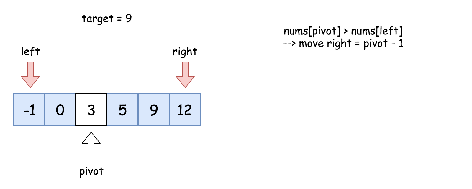 - If target < nums[pivot], 왼쪽에서 계속 검색 right = pivot - 1