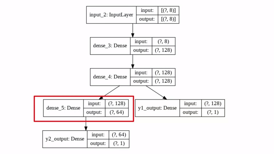 반면에 다른 분기점은 dense_4로부터 input을 받아 output을 (?,64)로 만드는 Dense(64)의 Layer와 연결되어 있습니다. y2_output은 dense_5로부터 input을 받아서 (?,1)의 output을 만들어 내고 있습니다.