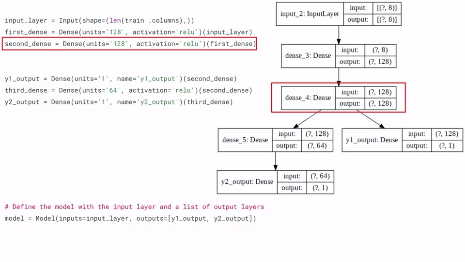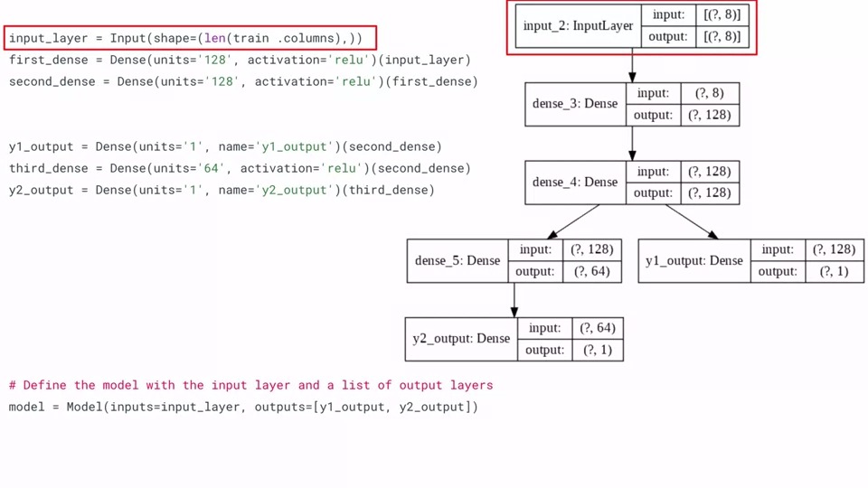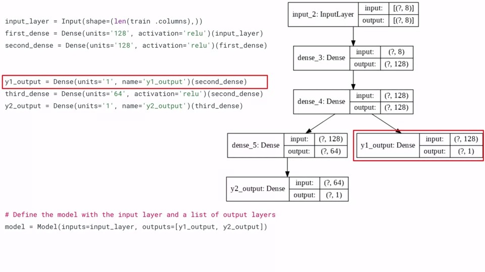 Here is how we'll build the model using the functional syntax. Notice that we can specify a list of outputs (i.e. [y1_output, y2_output]) when we instantiate the Model() class.