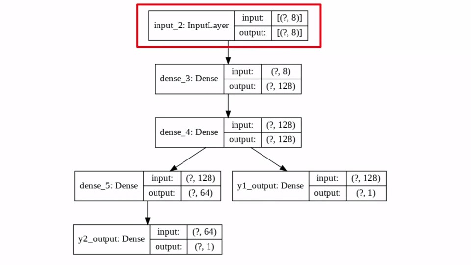마지막에 모델을 정의하는데 inputs는 1개이므로 input_layer를 넣어주고, outputs는 두개이므로 [y1_output, y2_output] 으로 선언해주면 완성이 됩니다.