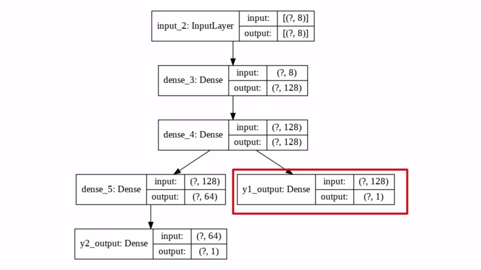 dense_4 이후로 Layer가 분기 된 것을 볼 수 있습니다. y1_output은 dense_4 layer로 부터 input을 받아서 그대로 (?,1) 의 output을 내보내고 있습니다.