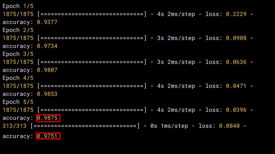 다음은 5 epoch동안 네트워크를 훈련시킨 결과입니다.