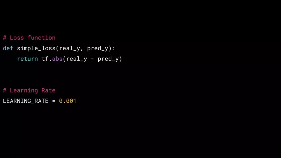 이 경우 real_y 값과 pred_y 값의 차이를 매우 간단한 손실 함수로 정의합니다. (차이에 절대값을 취함, simple_loss)