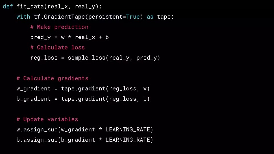 그런 다음 w 및 b 텐서의 경우 assign_sub를 호출하여 해당 값을 조정하기 위해 학습률과 gradient값을 곱하여 업데이트 할 수 있습니다.