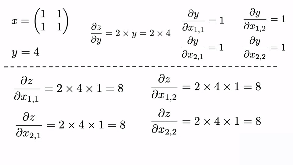 원래의 2x2행렬에 대해 미분할 때 8로 채워집니다.