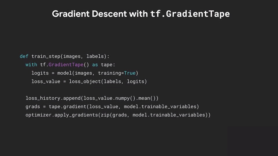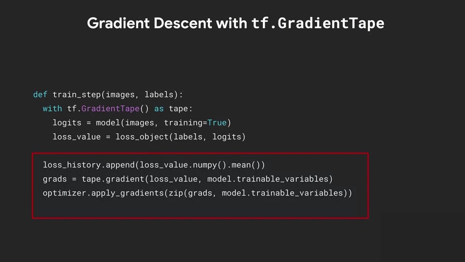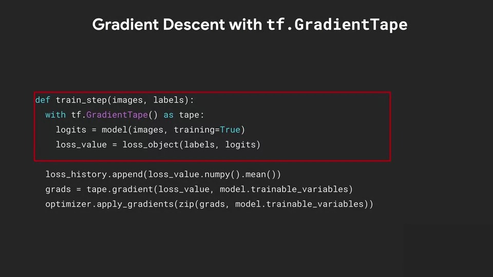 다음은 TensorFlow의 GradientTape API를 사용하여 학습 알고리즘의 Training 단계를 구현하는 방법에 대한 코드입니다. Training을 수행하려면 GradientTape의 context내에서 학습 알고리즘의 두 가지 중요한 단계를 수행해야 합니다.
