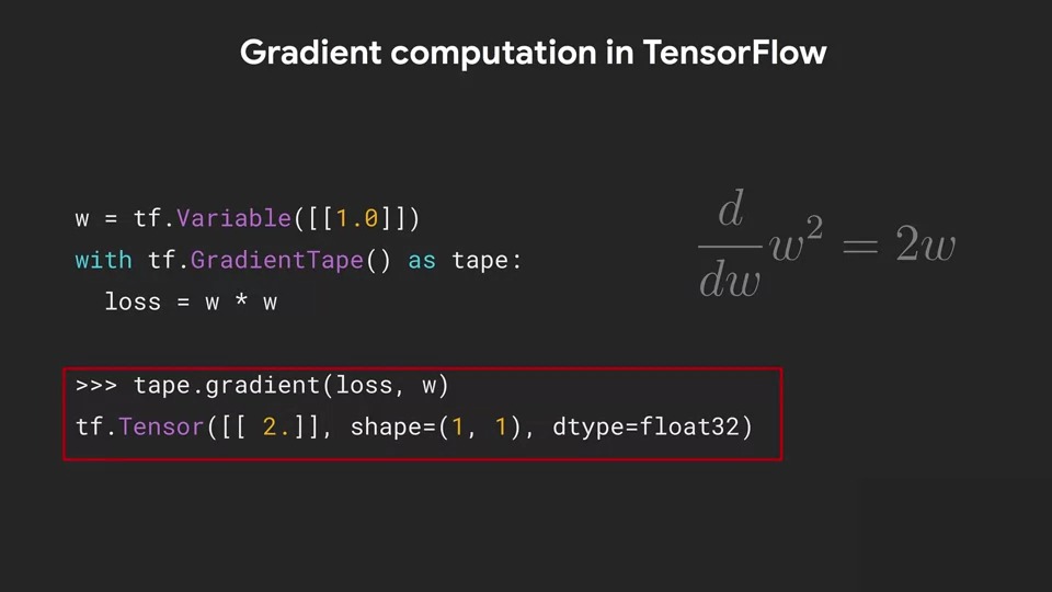 다음으로 미적분학에서 함수의 미분을 계산하는 방법과 유사하게 tape.gradient를 호출하여 입력 값 w에 대한 loss의 기울기를 계산할 수 있습니다.