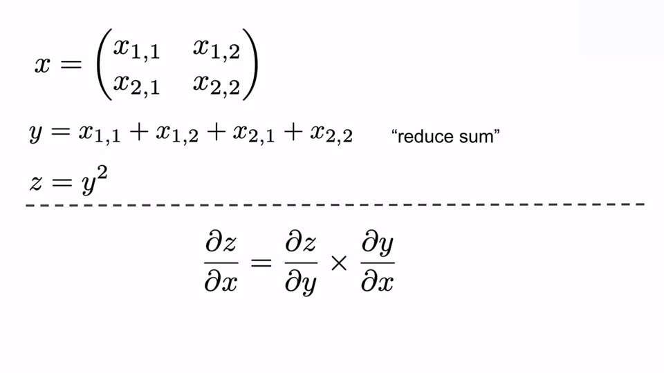 이 예에서 y는 x의 reduced_sum입니다. x의 이 특정 값에 대해 y는 1 + 1 + 1 + 1, 즉 4가 됩니다.