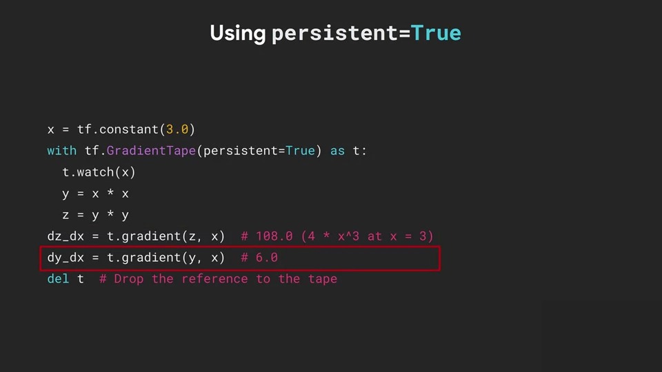 일반적으로 첫 번째 호출 후에 Gradient가 삭제되지만 이번에는 persistent = true로 설정하므로 Tape를 여러 번 사용할 수 있습니다.