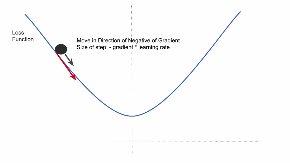 그런 다음 프로세스를 반복하고 매개변수에 대한 새 위치에서 Gradient를 가져오고 이를 사용하여 다음 단계의 방향을 결정합니다. 그런 다음 학습률에 따라 조정되는 방향으로 나아갈 수 있습니다.