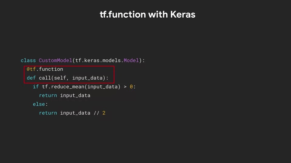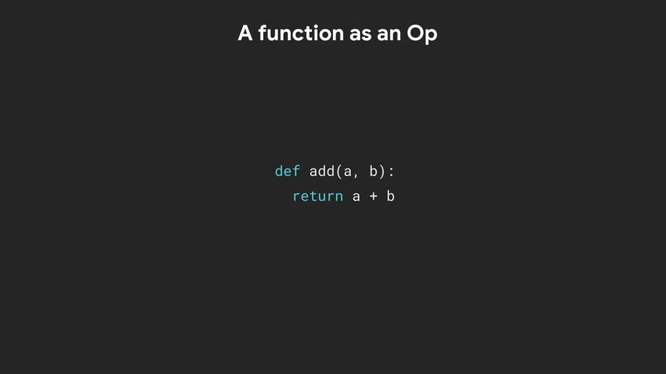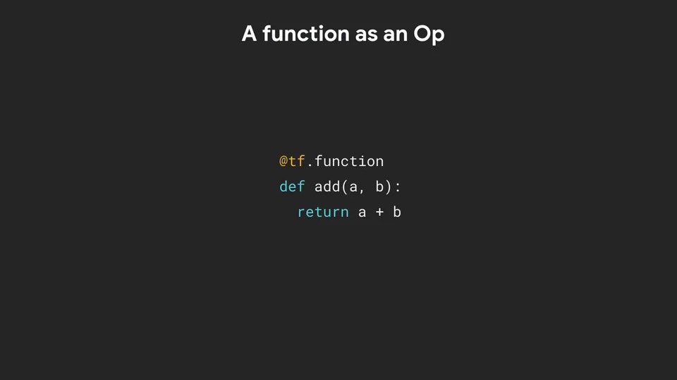 이 @tf.function는 사용자 정의 코드, a + b를 가져와 미리 빌드된 @tf.function 안에 래핑 하는 것으로 생각할 수 있습니다. 따라서 add 함수에는 이제 사용자 정의 코드와 결합된 @tf.function의 기능이 있습니다.
