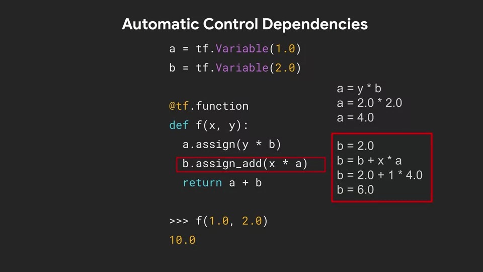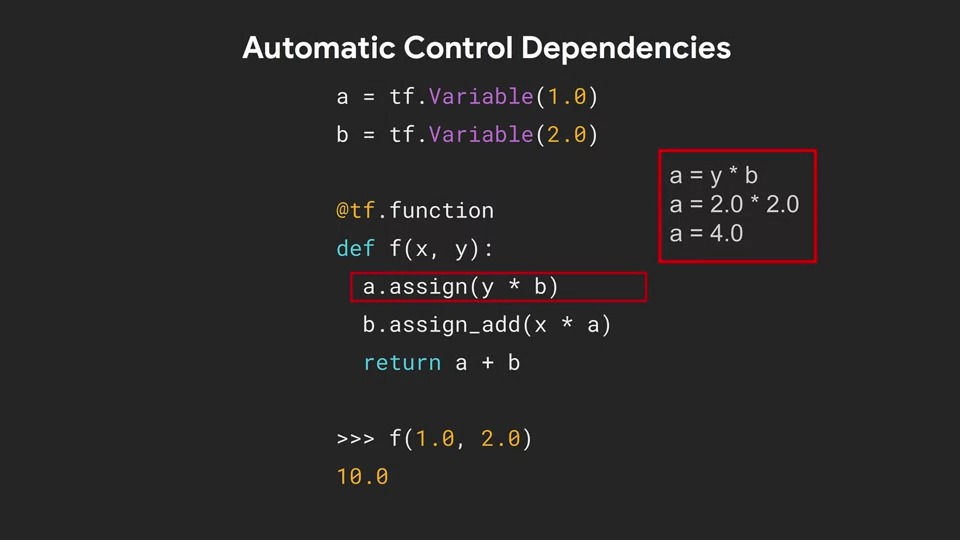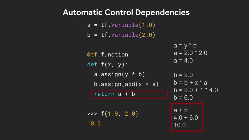AutoGraph에서 그래프에는 명시적 종속성이 있습니다. 즉, 그래프의 노드를 보면 그래프를 역방향으로 추적하여 실행에 의존하는 작업을 미리 알 수 있습니다.