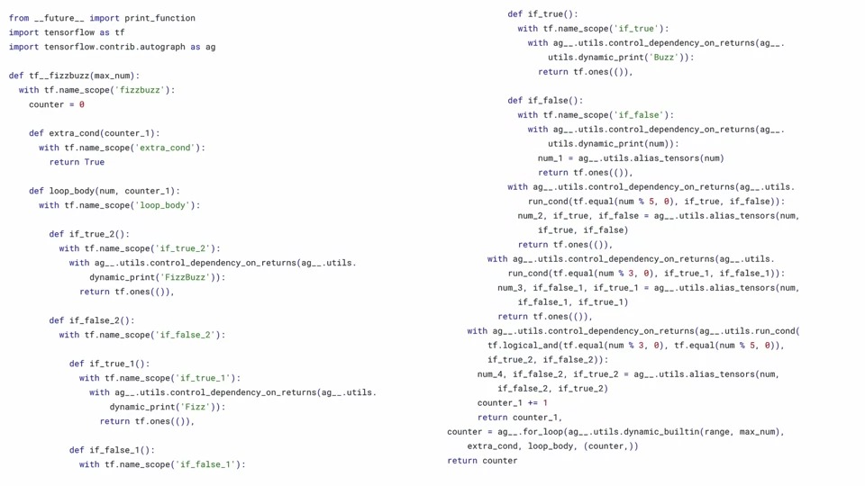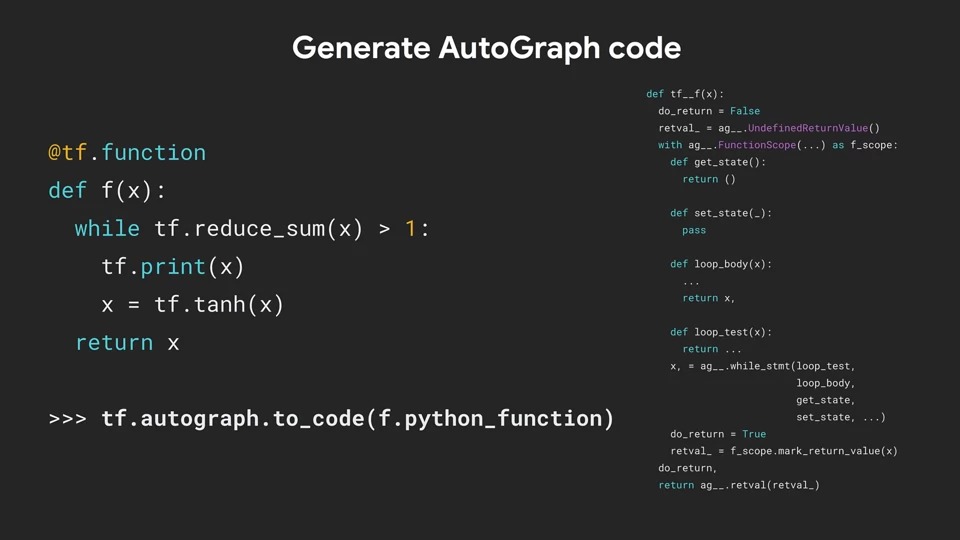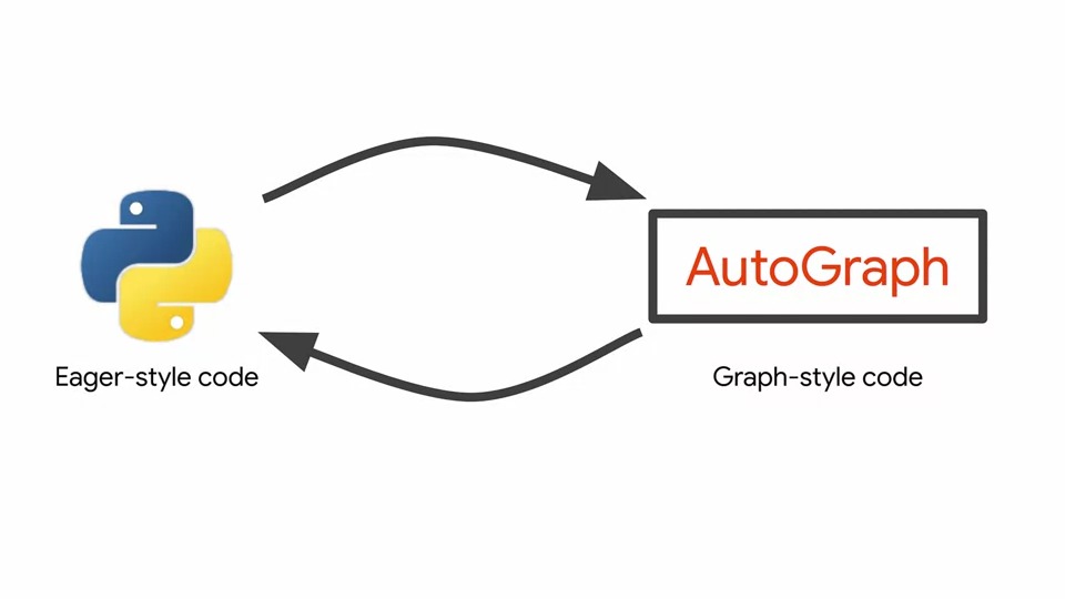 AutoGraph가 실제로 도움이 될 수 있는 것은 위의 그림과 같이 Eager-style의 Python 코드를 자동으로 그래프로 변환하고 그 반대로 변환할 수 있는 기술입니다.
