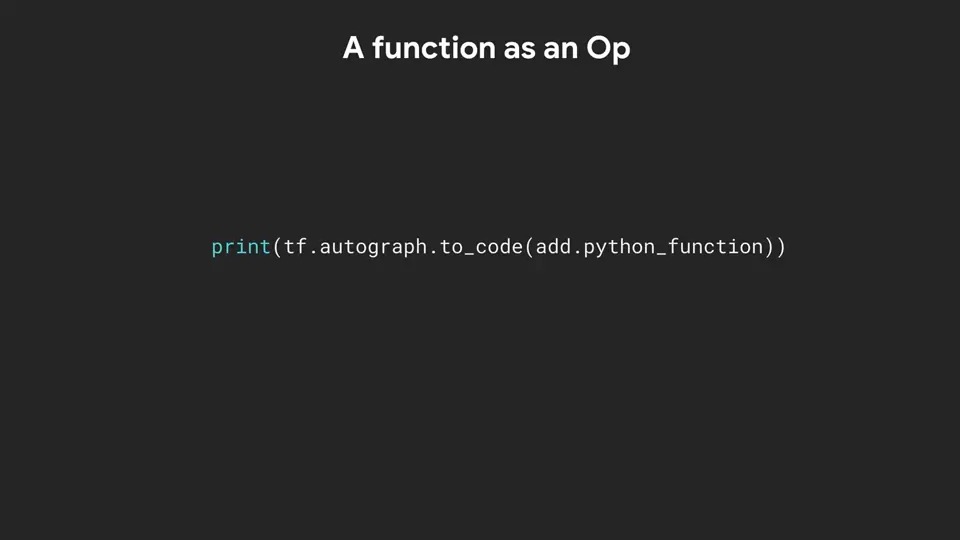 생성된 코드를 보려면 tf.autograph.to_code를 호출하여 python_function property와 함께 함수 이름을 전달하면 됩니다.