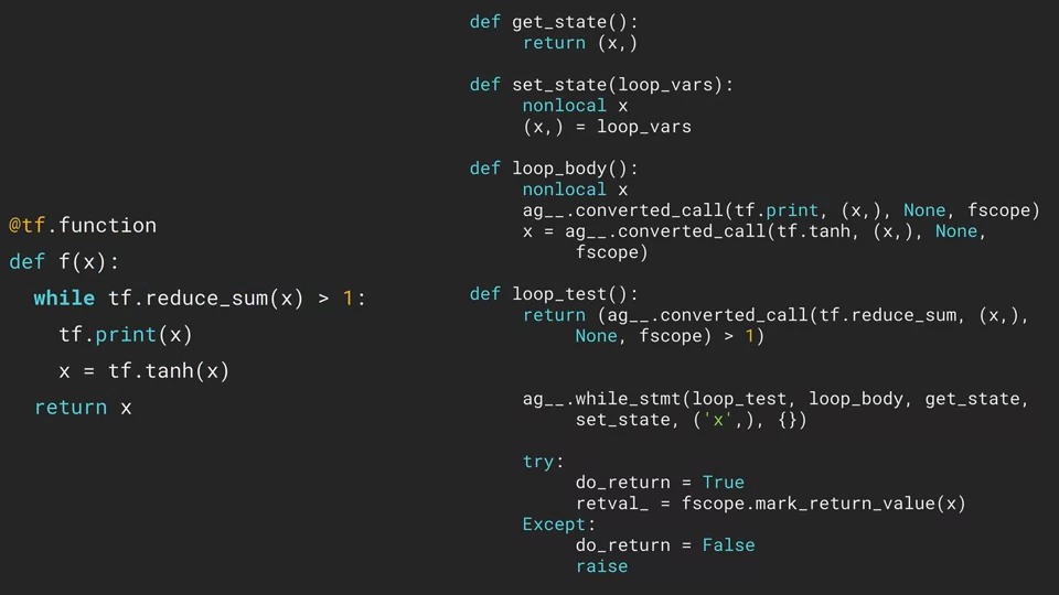 이것도 동일하게 왼쪽에 Python코드가 있고 오른쪽은 autograph가 생성한 코드입니다.