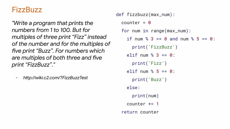 위에 간단한 게임인 FizzBuzz를 소개하고 있습니다. 7개의 숫자를 반복하는 간단한 알고리즘입니다.