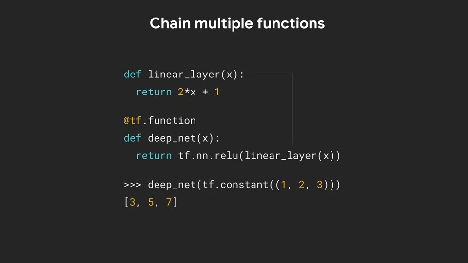 여기서 deep_net은 tf.function으로 decorate 되어 있지만 linear_layer는 그렇지 않습니다. 그러나 linear_layer는 deep_net에서 호출되기 때문에 linear_layer도 AutoGraph에 의해 그래프 모드로 변환됩니다.