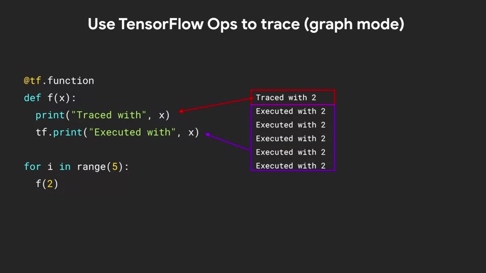 위에서는 "Traced with 2"가 5번 출력되었지만 여기에서는 단 한 번만 출력이 되고 tf.print문인 "Executed with 2"가 5번 출력이 되었습니다.