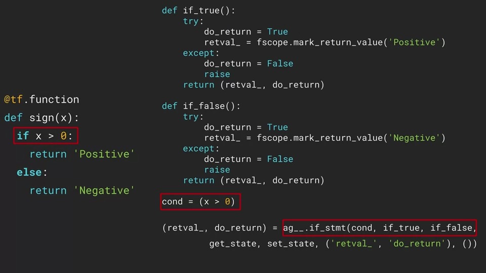 먼저 true/false로 평가되는 "x가 0보다 크다" 표현식은 cond라는 변수에 저장되고 그 아래 있는 ag__ 객체에는 여러 매개변수를 받는 if_stmt 함수가 있습니다.