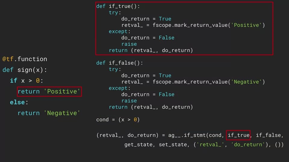 autograph는 conditional 함수도 그래프 코드로 변환을 성공적으로 하였습니다. 우리는 왼쪽의 코드처럼 구현하고 @tf.function으로 decorate만 해주면 됩니다.