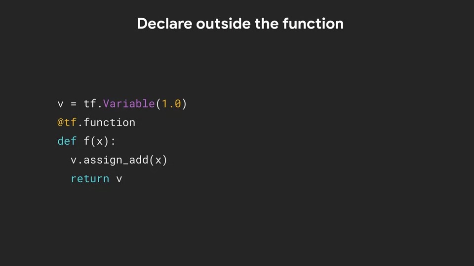 @tf.function을 사용하여 일반 Python 코드에서 자동으로 그래프를 생성하면 복잡한 그래프를 스스로 설계하지 않아도 됩니다. 복잡한 그래프가 있는 코드의 예는 동일한 변수가 일부 계산의 입력으로 사용되지만 다른 계산의 결과를 저장하는 데 사용될 수 있습니다.