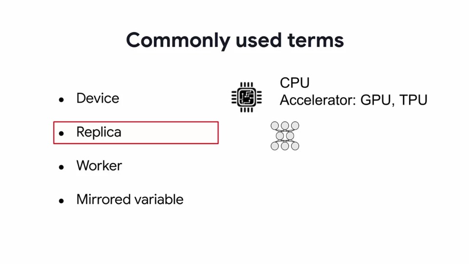 Training 동안 모델 variable의 복사본이 여러 device에 배치됩니다. 이 복사본을 종종 Replica(복제본)라고 합니다.