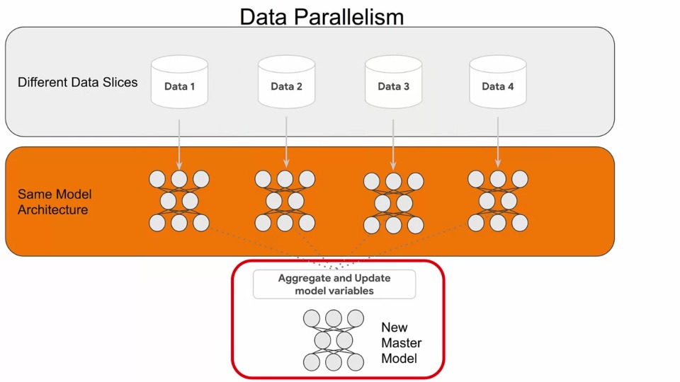 TensorFlow의 분산 교육은 데이터 병렬 처리를 중심으로 구축됩니다. 여러 장치에 동일한 모델을 복제하고 입력 데이터의 각각 다른 조각들을 실행시킵니다.